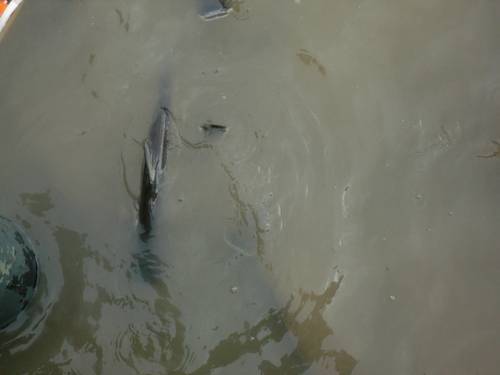 eine Fischzucht im Fluss ohne Absperrungen |